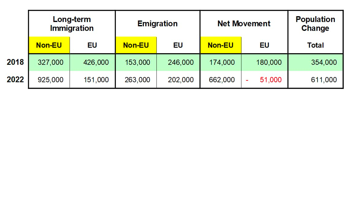 As we can see by the graph, in 2018 426,000 pesky Europeans came over here, taking the jobs that no one wanted and fixing things, compared with 327,000 non Europeans. By 2022, those figures changed a great deal with 151,000 Europeans coming over here and a mere 925,000 non Europeans. Since 2018, we now have 51,000 less Europeans over here but a net gain of 662,000 non Europeans, the majority of whom come from India, Nigeria and Pakistan.