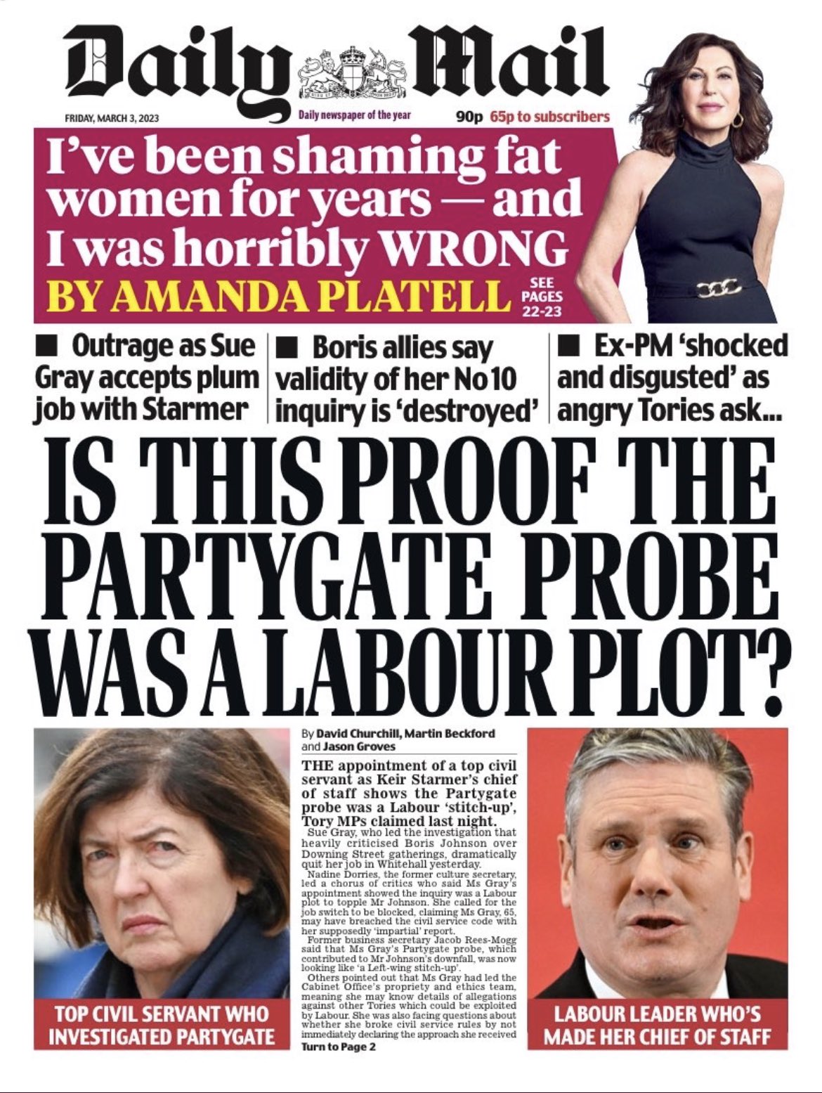 For the Mail and various other loonies like ‘Mad’ Nadine Dorries and the MP for the 19th century Jacob Rees-Mogg, the idea that the former civil servant Sue Gray should take a job as Keir Starmer’s chief of staff, after conducting an inquiry that proved that Johnson and co were on the lash, results that were accepted by the party-goers themselves, is too much to bear. Johnson himself is apparently “shocked and disgusted” that Ms Gray should dare take on another job after quitting the civil service merely proves she’s some Corbynite plotter who made up facts about his squalid behaviour.