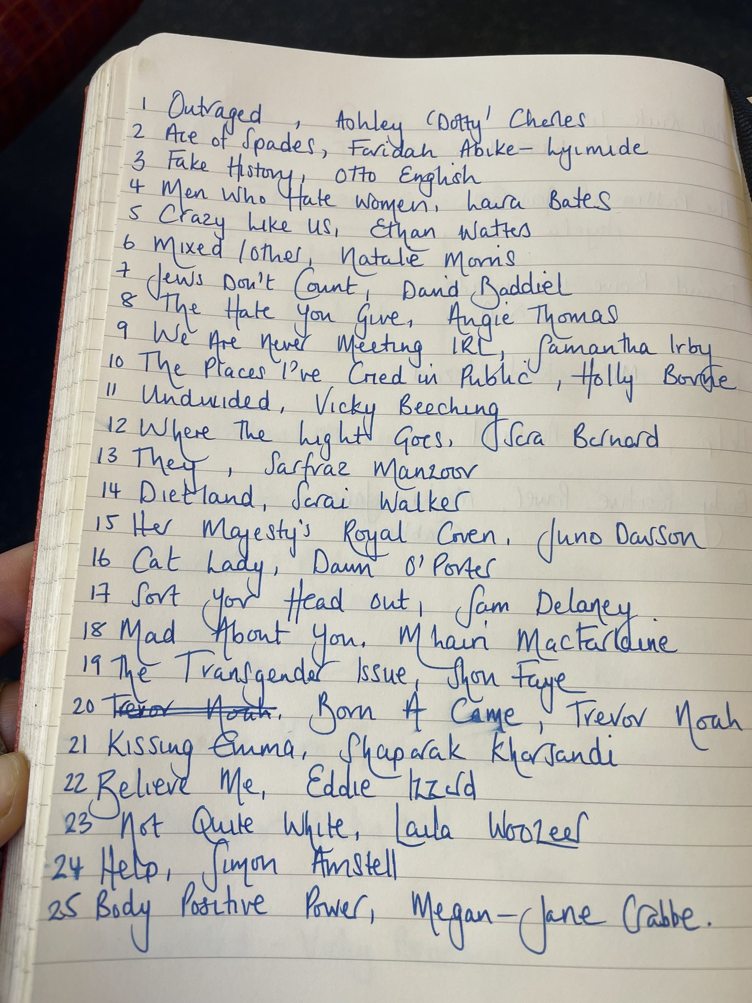 Skipping through twitter this morning, I came across a tweet by the author and broadcaster Natasha Devon. In it, she lists 25 books which she regards as “fantastic” and “life-changing”. I get that with books. Although many of her selections would appear to be well above my levels of intelligence – I own two of them: David Baddiel’s brilliant Jews Don’t Count and Eddie Izzard’s Believe Me – it’s not just the book selection that impresses me. It’s her handwriting. I just love it.